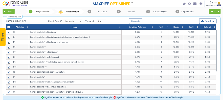 The max diff simulator is an effective tool for computing preference share, counts report, average utilities etc. You can also select which items are to be made available to respondents (as if they were in competition with one another within a marketplace).
